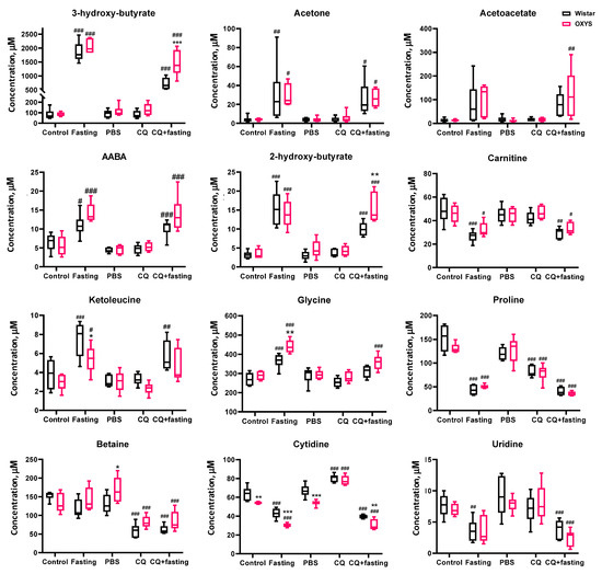 Figure 4. Concentrations of some serum metabolites for Wistar (black boxes) and OXYS (pink boxes) rats under autophagy modulation by 48 h fasting, chloroquine (CQ) treatment, and combined effects of fasting and CQ. The complete set of boxplots of altered serum metabolites is given in Figure S3. Data presented by boxplots: medians, the 25–75% interquartile range (bars), and min–max (error bars). Intact control serves as a control group in the case of fasting, and phosphate-buffered saline (PBS) group serves as a vehicle control to CQ and CQ + fasting treatment groups. Notation means: * p < 0.05, ** p < 0.01, *** p < 0.001 OXYS vs. Wistar rats from the same treatment group; # p < 0.05, ## p < 0.01, ### p < 0.001 vs. control group (intact control in the case of fasting, PBS vehicle control in the case of CQ/CQ + fasting) within the same strain of rats, post hoc comparisons after ANOVA or Kruskall–Wallis test.