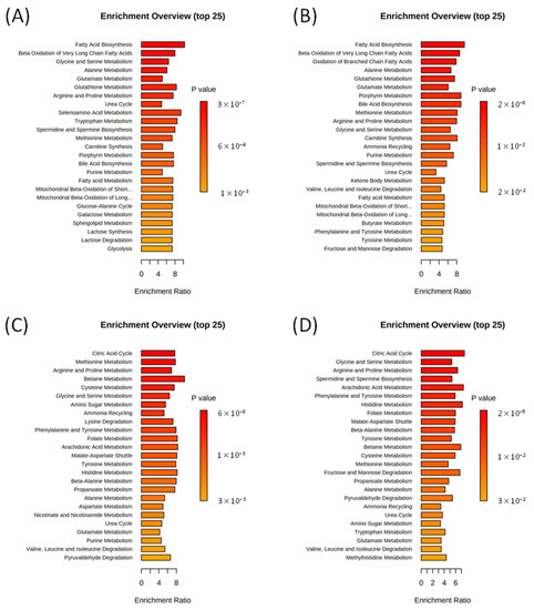 Figure 5. Summary plots for quantitative enrichment analysis (MSEA) based on the comparison of serum metabolomic compositions: of fasting and control Wistar (A) and OXYS (B) rats; of CQ-treated and control Wistar (C) and OXYS (D) rats.
