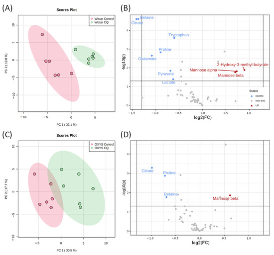 Figure 6. The metabolomic profiles of control and CQ treatment groups. PCA score plots and Volcano plots of blood metabolites of Wistar (A,B) and OXYS (C,D) rat strains. In Volcano plots, horizontal line depicts a cut-off of FDR-adjusted p-value = 0.05, metabolites with fold change threshold (CQ treatment vs. control) = 1.5 are highlighted.