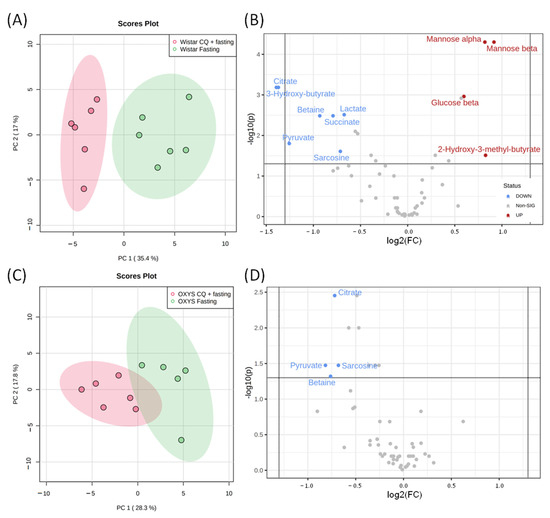 Figure 7. The metabolomic profiles of fasting groups with and without CQ treatment. PCA score plots and Volcano plots of blood metabolites of Wistar (A,B) and OXYS (C,D) rat strains. In Volcano plots horizontal line depicts a cut-off of FDR-adjusted p-value = 0.05, metabolites with fold change threshold (CQ treatment vs. fasting) = 1.5 are highlighted.