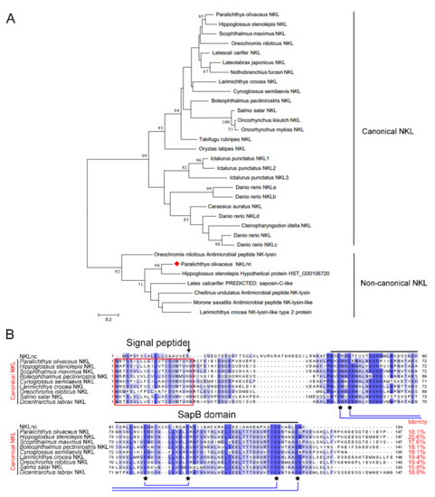 To date, NK-lysin homologues were reported in at least 14 fish species, which, with the exception of the NKL from large yellow croaker (LCNKL2), are closely related and belong to the same phylogenetic group. These canonical fish NKLs include the flounder NKL reported in 2007 [34]. In the present study, we identified and characterized a non-canonical NKL, NKLnc. NKLnc possesses structural features conserved in human granulysin and mammalian/teleost NKLs, including the SapB domain and the six disulfide bond-forming cysteine residues, which define NKLnc as a member of the NK-lysin family. However, NKLnc shares low sequence identities with the canonical fish NKLs and belongs to a phylogenetic group distinctly separated from that formed by the canonical fish NKLs. In addition, the signal peptide cleavage site of NKLnc is markedly different from that of canonical NKLs. These characteristics indicate that NKLnc represents a novel type of fish NKL. Nevertheless, the presence in NKLnc of the conserved structures suggests the conservation of basic NKL functions.