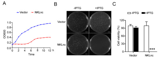 The effect of NKLnc expression on host bacterial growth. (A) Escherichia coli was transformed with the backbone vector or the vector carrying the NKLnc gene inducible by IPTG. The bacteria were cultured in the presence of IPTG and determined for growth at different hours. (B,C) The above E. coli cells were plated in an agar plate supplemented with or without IPTG, and bacterial growth was observed after overnight incubation. Scale bar, 1 cm (B). The percentages of bacterial survival were determined (C). Values are the means of triplicate assays and shown as means ± S.D. *** p < 0.001.