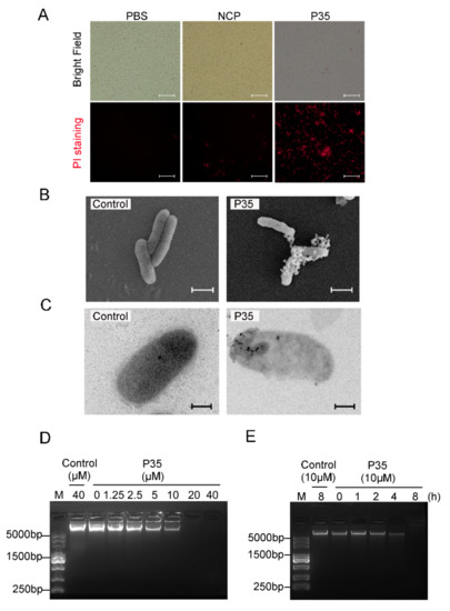 2.5. P35 kills Bacteria by Damaging Bacterial Plasma Membrane and Chromosomal DNA