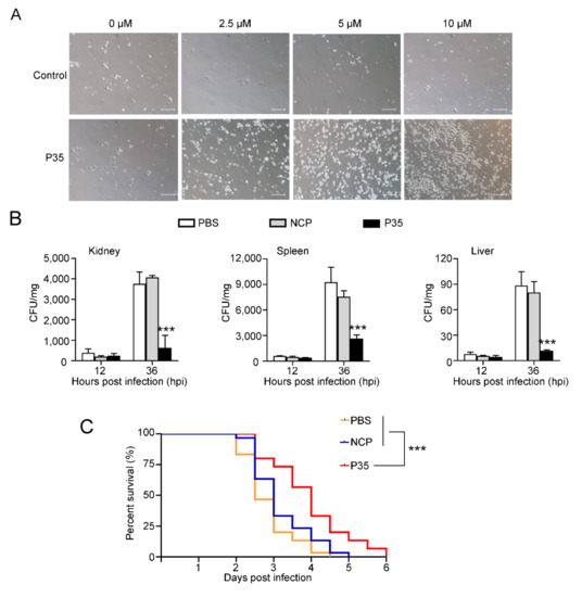 4.13. In Vivo Effect of P35 on Bacterial Infection and Host Survival