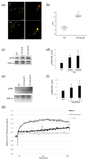 As a well-known signal of the sperm cell’s activation, pERK levels were measured by Western blot after the PA stimulus in purified spermatozoa. We observed a pERK accumulation in a dose-dependent manner, with a 50 mM PA dose that attained statistical significance (Figure 1c,d). Furthermore, we performed time-course experiments for 5′ and 10′ minutes that revealed a time-dependent accumulation of ERK protein phosphorylation upon PA treatment, too (Figure 1e,f). Moreover, we found that 5 mM AA treatment was able to mediate pERK accumulation, too (Supplementary Figure S2a,b). Finally, we confirmed pERK increase in sperm cells upon 500 µM of bourgeonal treatment, as previously reported [11] (Supplementary Figure S2c,d).