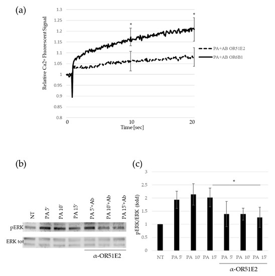 To address whether propionate-mediated sperm activation depends on the binding to OR51E2, seminal fluid was pretreated with the specific antibody against OR51E2. As a control, seminal fluid was pretreated with an antibody against OR6B2, another olfactory receptor unresponsive to PA [23]. At both the time points analyzed, the pre-treatment of sperm with α-OR51E2 antibody significantly reduced the PA-mediated Ca2+ signal in comparison to the pre-treatment with α-OR6B2 (Figure 2a). To confirm the role of ERK phosphorylation in the aforementioned pathway, we analyzed by Western blot the pERK levels upon PA treatment with α-OR51E2 or α-OR6B2 antibodies pre-incubation. As shown in Figure 2b,c, we detected a time-dependent accumulation of pERK, impaired by seminal fluid pre-incubation with the α-OR51E2 antibody (Figure 2b,c).