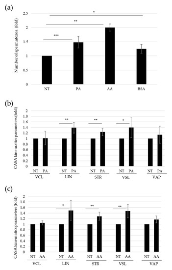 We then made use of the CASA system to analyze the kinematic parameters in the swim-up migrated fraction of spermatozoa. We observed statistically significant higher values for some motility parameters, in particular, linearity (LIN) and straightness index (STR), in sperm cells exposed to PA and AA in comparison with the control medium (Figure 3b,c, respectively). On the contrary, we did not observe significant changes in velocity along the average path (VAP) and velocity along the curvilinear path (VCL) (Figure 3b,c, respectively).