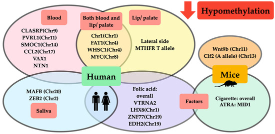 Schematic representation of DNA hypomethylation in orofacial clefts from animal and clinical studies. Hypomethylation from clinical studies demonstrated that (1) hypomethylated genes and chromosomes in human blood (pink circle) were CLASRP(Chr9), PVRL1 (Chr11), SMOC1(Chr11), CCL2(Chr17), VAX1, and NTN1; (2) hypomethylated genes and chromosomes in lip/ palatal tissue (yellow circle) were lateral side of lip tissue, MTHFR T allele; (3) hypomethylated genes and chromosomes found either in blood or lip/palatal tissue (intersection area between pink and yellow circle) were Chr1(Chr1), FAT1(Chr4), WHSC1(Chr4), and MYC(Chr8); (4) hypomethylated genes and chromosomes in saliva (blue circle) were MAFB(Chr20) and ZEB2(Chr2); and (5) factors affecting DNA hypomethylation in clinical studies (purple circle) included folic acid affecting hypomethylation of overall methylation of VTRNA2, LHX8(Chr1), ZNF77(Chr19), and EDH2(Chr19). Hypomethylation from animal studies demonstrated that (1) hypomethylated genes and chromosomes in mice (orange circle) were Wnt9b(Chr11) and Clf2(A allele)(Chr13); and (2) factors affecting DNA hypomethylation in studies on mice (green circle) included cigarettes affecting hypomethylation of overall DNA methylation and ATRA affecting hypomethylation of MID1.