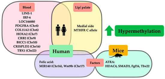 Schematic representation of DNA hypermethylation in orofacial clefts from animal and clinical studies. Hypermethylation from clinical studies demonstrated that (1) hypermethylated genes and chromosomes in human blood (pink square) were LINE-1, IRF-6, LOC146880, PDGFRA(Chr4), COL11A2(Chr6), HOXA2(Chr7), CRB2(Chr9), BICC1(Chr10), CRISPLD2(Chr16), and TBX1(Chr22); (2) hypermethylated genes and chromosomes in lip/palatal tissues (yellow square) were medial side of lip tissues, MTHFR C allele; and (3) factors affecting DNA hypermethylation in clinical studies (purple square) were folic acid affecting hypermethylation of MIR140(Chr16) and Wnt9b(Chr17). Regarding hypermethylation in animal studies, factors affecting DNA hypermethylation in studies on mice (green circle) included ATRA affecting hypermethylation of HDAC4, SMAD3, Fgf16, and Tbx22.