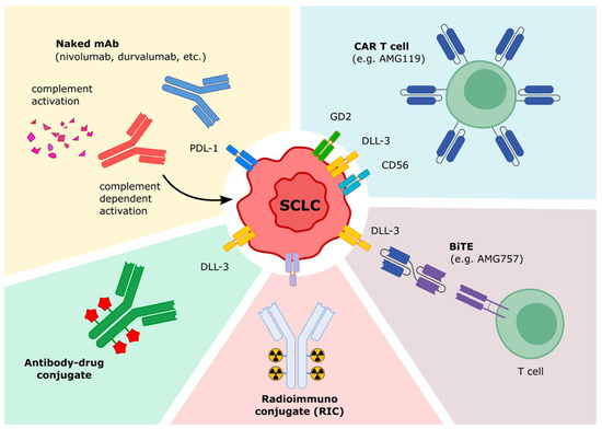 Recent advances in treating SCLC shed light on the pivotal role of the immune system. In addition to checkpoint inhibitors, immunotherapy offers several different strategies, including naked monoclonal antibodies (mAbs) targeting a TAA, conjugated antibody, bispecific antibodies, immunocytokines, radioimmunoconjugate antibodies and cellular therapies (Figure 1) [98].