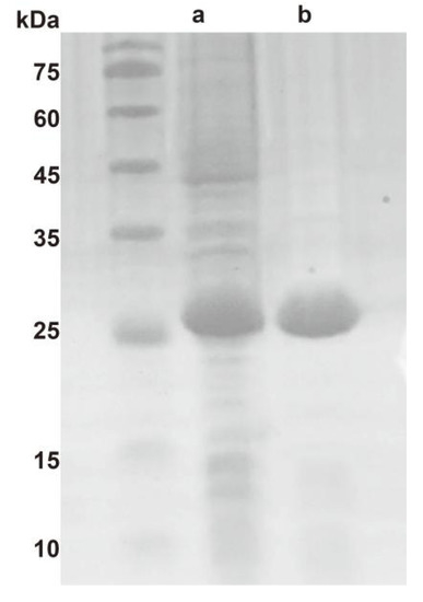 Detection of Ton1914 by SDS–PAGE. (a) Crude enzyme; (b) Purified protein heated at 80 °C for 10 min.
