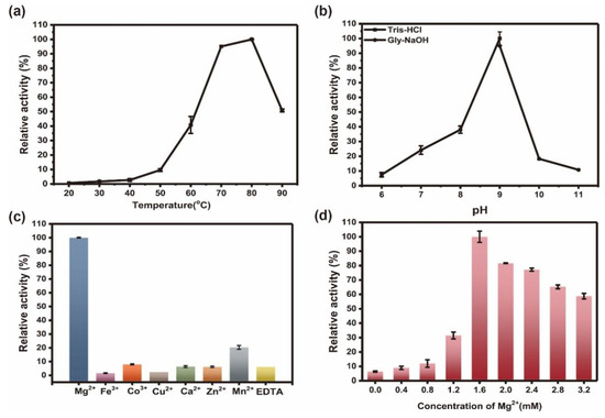Characterization of Ton1914. (a) The optimum temperature of Ton1914 detected at 50 mM Tris-HCl buffer (pH 9.0); (b) The optimum pH of Ton1914 detected at 80 °C; (c) The effect of different metal ions and EDTA (final concentration 2 mM) on Ton1914; (d) The effect of Mg2+ concentration on Ton1914.