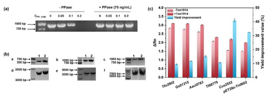 The facilitation of polymerase chain reaction (PCR) by Ton1914. (a) The inhibitory effect of PPi on PCR, Gs01315 (954 bp) was used as template, 0, 0.05, 0.1, 0.2 mM PPi was added, and PCR was conducted with or without 70 ng/mL Ton1914, respectively. The PCR system and reaction procedure were performed according to the instructions of the PrimeSTAR® HS DNA Polymerase reagent kit using conventional PCR equipment. (b) Agarose gel electrophoresis results of qPCR with different gene templates, a: Tfu2902 (516 bp), b: Gs01315 (954 bp), c: Aaci0783 (1215 bp), d: Tl08779 (2494 bp), e: Cus2552 (3162 bp), f: pET28a−Tn0602 (6710 bp); 1 was the groups without Ton1914, 2 was the groups with Ton1914; (c) The final fluorescence intensity of qPCR for six genes was conducted with and without Ton1914; all gene templates were amplified using the same amplification procedure and underwent 35 qPCR cycles.