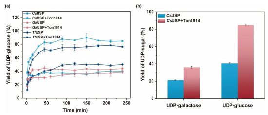 Improvement in Ton1914 for UDP-sugar synthesis. (a) The effect of Ton1914 on the yield of UDP-glucose catalyzed by different UDP-glucose pyrophosphorylases (CsUSP, GkUSP, TfUSP); (b) The yields of UDP-glucose and UDP-galactose catalyzed by CsUSP and Ton1914.