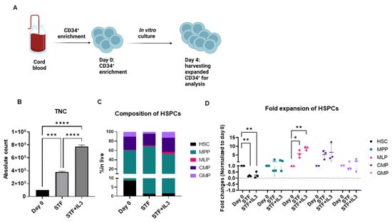 Human CD34+ cells were expanded in cytokine-supplemented medium: (A) Schematic experimental design. (B) Total Nucleated Cells (TNC) increased between three- and eightfold in presence of cytokine after 4 days of culture (n = 3, *** p < 0.001, **** p < 0.0001, one-way Anova). (C) Stacked bar graph shows composition of Hematopoietic Stem cells and Progenitors (HSPCs) on day 0 (after enrichment) and after 4 days of culture with the indicated cytokine cocktails. (D) Dot plot shows fold changes of expanded HSPCs on day 4 compared to day 0. (n = 3, * p < 0.05, ** p < 0.01, one-way Anova).