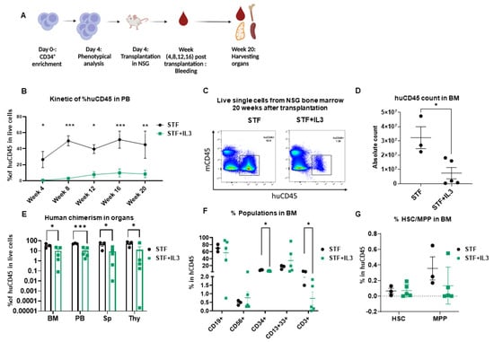 IL3 has an adverse effect on human engraftment in NSG mice: (A) Schematic experimental design. (B) Human CD45 engraftment in PB over time (n = 3–5; * p < 0.05, ** p < 0.01 and *** p < 0.001, 2-way Anova test with multiple comparison). (C) Representative flow cytometry plots of bone marrow cells harvested from mice that received expanded cells. (D) Absolute count of human CD45+ cells in bone marrow after 20 weeks of transplantation. (n = 3–5; * p < 0.05 unpaired t-test). (E) Percentage of human CD45 cell engraftment in different organs (BM = Bone marrow, PB = Peripheral Blood, Sp = Spleen, Thy = Thymus) in primary recipient NSG mice 20 weeks after transplantation (n = 3–5; * p < 0.05, and *** p < 0.001, unpaired t-test). (F) Percentage of CD19+, CD56+, CD34+, CD13+33+ and CD3+ populations within the huCD45+ BM population (n = 3–5; * p < 0.05, unpaired t-test). (G) Percentage of hematopoietic stem cells (HSC) and Multipotent progenitor (MPP) in BM of primary recipient NSG mice 20 weeks after transplantation (n = 3–5; unpaired t-test).