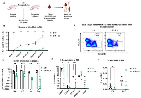 Human engraftment was assessed in PB from week 4 up to 20 weeks post-transplantation. Additionally, after the secondary transplantation, IL3 addition led to a significant decrease in human chimerism in PB (Figure 3B) and similarly in BM, spleen and thymus (Figure 3C,D); this decrease is more pronounced than the primary transplantation. Cells within the huCD45+ gate were further analyzed for the presence of different lineages development in BM. IL3-treated stem cells differentiated much worse into CD19+, CD34+, and CD56+ cells, presumably due to lower self-renewal of HSC populations in BM (Figure 3E,F).