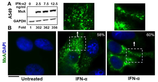 Human hepatoma cell line Huh7 was a gift from Dr. Charles M. Rice, The Rockefeller University. New York, NY, USA. Human Hep3B, and A549 cells were obtained from the ATCC (Manassus, VA, USA). Additional aliquots of the A549 cells and its derivative line A549-hACE2 was obtained from BEI Resources/ATCC (Manassus, VA). The respective cell lines were grown in DMEM (Corning Cat. No. 10-013-CV, with glutamine, Na-pyruvate and high glucose) supplemented with 10% v/v fetal bovine serum (FBS) in T25 flasks [13,15]. For experiments, the cells were typically plated in 35 mm dishes without or with cover-slip bottoms [13,15]. Recombinant human IFN-α2 was purchased from BioVision (Milpitas, CA, USA) and typically used at 10–20 ng/mL for 2 days. Whole-cell extract and Western blot analyses for MxA were carried out as previously reported [12,13].