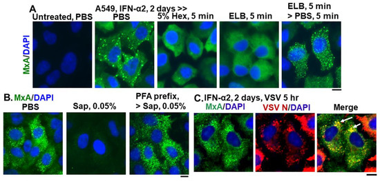 Figure 2 summarizes data showing that cytoplasmic structures derived from endogenous MxA in IFN-treated A549 lung cells, had key properties previously observed for biomolecular condensates of exogenously expressed GFP-MxA [13]. The endogenous MxA condensates were disassembled rapidly by exposure of cells to 1,6-hexanediol (5%), to hypotonic ELB and also reassembled upon subsequent exposure to isotonic PBS (Figure 2A). The endogenous MxA condensates required an intact plasma membrane for their integrity in that they were disassembled by exposure of cells to PBS containing saponin (0.05%) (Figure 2B). This observation that cell integrity was required for maintenance of MxA higher-order structures in the cytoplasm places limitations on interpretation of prior data on MxA oligomerization derived from previous solution-based analyses [9,10,11,18,19,20,21,22]. Indeed, as previously shown for stress granules and processing bodies (P-bodies) [32,33,34], prefixing of cells with 2% PFA for 10 min blocked the subsequent dissolution by saponin of MxA cytoplasmic structures (Figure 2B). Moreover, Figure 2C shows that the VSV N protein associated with condensates of endogenous MxA in A549 cells. Overall, the data in Figure 1 and Figure 2, taken together confirm that many of the properties observed previously for exogenously expressed GFP-MxA in Huh7 hepatoma cells, were also observed for cytoplasmic structures formed by endogenous MxA in IFN-α-treated A549 lung cells.