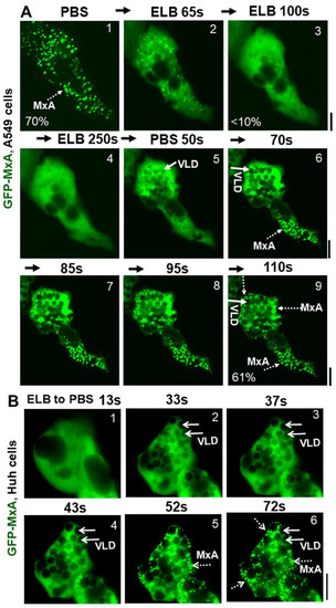 Marked accumulation of vacuole-like dilations (VLDs) in cells preceding isotonicity-driven reassembly of GFP-MxA condensates. Panel (A), Live-cell time-lapse images (time designated in seconds) of an A549 cell showing rapid disassembly of GFP-MxA condensates upon exposure to hypotonic ELB, and rapid reassembly of GFP-MxA into new condensates upon shift up to isotonic PBS (broken white arrows). Solid white arrows point to VLDs which accumulate in the cytoplasm prior to GFP-MxA condensate reassembly. The % numerals in respective panels are an estimate of the fraction of total cellular GFP-MxA in condensates. Panel (B), Live-cell time-lapse images (time designated in seconds) of a GFP-MxA expressing Huh7 cell previously shifted to hypotonic ELB (thus the GFP-MxA is dispersed) showing rapid reassembly of GFP-MxA into new condensates upon shift up to isotonic PBS (broken white arrows). Solid white arrows point to VLDs which accumulate in the cytoplasm prior to GFP-MxA condensate reassembly. Scale bars = 20 µm.