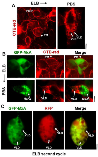 Additional evidence for the above interpretation was obtained by the observations that in cells doubly expressing GFP-MxA condensates and soluble red fluorescent protein (RFP) hypotonic disassembly was accompanied by a mixing of the green and red fluorescence, and subsequent isotonicity-driven GFP-MxA condensate reassembly was confined to RFP-containing inter-VLD spaces (Figure 4). As expected, the VLD spaces were devoid of cytosolic RFP (Figure 4), consistent with the formation of VLDs by engulfment of extracellular medium during internalization of the plasma membrane [35,36,37,38,39,40,41]. Evidence that such VLDs were indeed lined by the plasma membrane was obtained using Alexafluor A594-tagged cholera toxin B (CTB) which binds the plasma membrane [42] in ELB-treated cells, and is then rapidly internalized into VLDs when cells were shifted to isotonic medium (Figure 5A,B). In cells in hypotonic ELB, the disassembled GFP-MxA was distributed in the cell contained within boundaries demarcated by CTB-red-marked plasma membrane (Figure 5B, top row). Subsequent GFP-MxA condensate reassembly took place outside of the CTB-red lined VLD spaces (Figure 5B, bottom row).