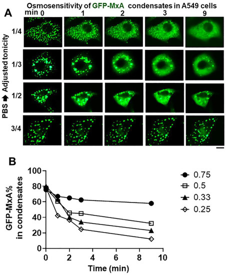 Hypotonicity-concentration dependence of the disassembly of GFP-MxA condensates. Panel (A), Cultures of live A549 cells expressing GFP-MxA condensates were first imaged in isotonic PBS, and then shifted to PBS diluted to 1/4, 1/3, 1/2, and 3/4 strength isotonicity using water. Individual cells in respective cultures were imaged in a time-lapse mode. Scale bar = 10 µm. Panel (B), Quantitation of the extent of GFP-MxA (as % of total in the cell) in condensates in the images shown in Panel (A). This quantitation was carried out using a Fourier filter in Image J to subtract objects of small radius (as illustrated in Figure 7B).
