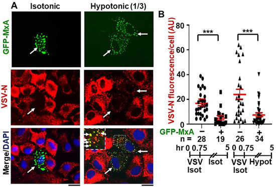 Figure 9A,B shows that continued maintenance of cells in one-third isotonic medium for >4 h also had little effect on the antiviral activity of GFP-MxA. Remarkably, many cells showed the co-localization of VSV-N with the reassembled GFP-MxA condensates (Figure 9A). Overall, the antiviral activity of GFP-MxA against VSV largely survived this edema-like hypoosmolar stress.