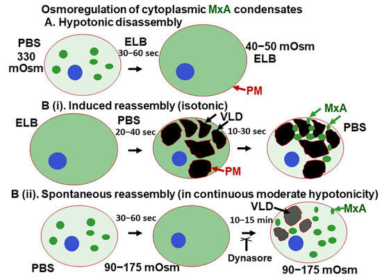 Schematic summary of osmoregulation of cytoplasmic MxA condensates. ELB, hypotonic erythrocyte lysis buffer; PBS, phosphate-buffered saline; PM, plasma membrane (displayed using CTB-red as in Figure 5); VLD, vacuole-like dilatation.