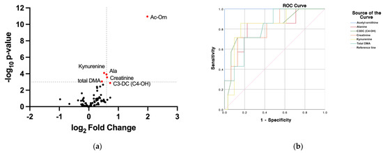 (a) Volcano plot (statistical significance versus log2 fold change) upon comparing data from control and diabetes groups. Red color indicates data points for molecules whose log2 FC > |0.4| and p < 0.001. (b) ROC curve of the six selected molecules.