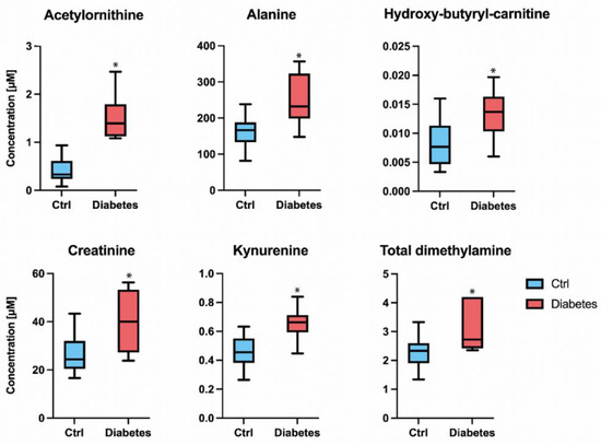 Comparison of the concentration of N-acetylornithine, alanine, hydroxy-butyryl-carnitine, kynurenine, creatinine, and total DMA in the aqueous humor of the two groups. Median in box-and-whisker plots (whiskers indicate the highest and lowest values determined for every molecule in each group, control, or diabetes). * p-value < 0.001.