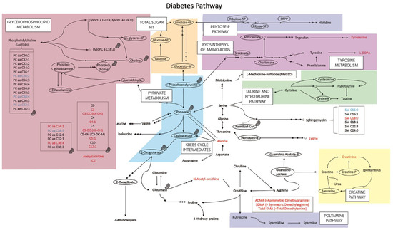 Metabolic pathway map summarizing the results. In light blue, the metabolite whose concentration is reduced in diabetes samples; and in red, the metabolites whose concentration is increased in the diabetes samples (compared with values in samples from healthy controls). Molecules whose concentration was not determined are within ellipses; they are included as nodes in metabolism interconnections. Areas in color represent the main metabolic pathways. The mitochondria symbol indicates a molecule/group of molecules that may be in mitochondria or are directly/indirectly related to mitochondria.