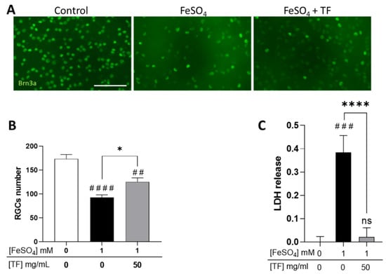 Because glaucomatous neuropathy is thought to result from intricate mechanisms including hypoxia, excitotoxicity, and iron dysmetabolism, we submitted rat retinal explants to several stresses and explored if TF could protect RGCs. Explants were subjected to 1 mM FeSO4 for 24 h and maintained in culture until 96 h in the presence of TF at 50 mg/mL, a concentration previously shown to protect retinas ex vivo [24]. At the end of the incubation period, RGCs were immunolabeled with anti-Brn3a antibody, a specific marker for RGCs, and counted. Iron induced a significant decrease in RGC number (46.7 % reduction, p < 0.0001; Figure 1A,B) and a drastic increase in lactate dehydrogenase (LDH) release (p < 0.001, Figure 1C), attesting to extensive cell membrane damage. Treatment with TF significantly reversed iron-induced toxicity, preserving 40.6 % of the RGCs when compared to untreated FeSO4-exposed explants (p = 0.0121; Figure 1B), whereas TF applied alone to the explant did not modify RGC survival [24]. TF also precluded FeSO4-induced LDH release (Figure 1C), demonstrating preservation of cell integrity.
