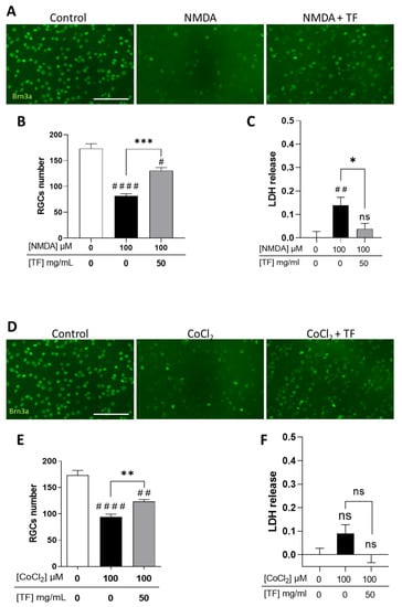 We first confirmed that RGCs were sensitive to excitotoxicity induced by the glutamate receptor agonist NMDA (Supplementary Figure S1) and to hypoxia induced by cobalt chloride (CoCl2) (Supplementary Figure S2), with a dose-dependent loss of RGCs when stresses were applied for 24 h and explant cultures extended up to 96 h total. Under these conditions, photoreceptors were spared by the two death-inducers (Supplementary Figures S1 and S2). When applied at 100 µM, NMDA led to a significant decrease in the number of RGCs (53.0%, p < 0.0001 compared to control; Figure 2A,B) correlating with an increase in LDH release (Figure 2C). TF significantly prevented part of the NMDA-induced RGC loss (53.5% compared to NMDA-exposed explants, p = 0.0004; Figure 2B) and reduced LDH release (Figure 2C). Similarly, 100 µM CoCl2 led to a significant loss of RGCs (45.7%, p < 0.0001 compared to control; Figure 2D–E) which was prevented by TF (37.1% compared to CoCl2-exposed explants, p = 0.0072). It is of note that no significant LDH release was observed after CoCl2 exposure, suggesting a non-necrotic cell-death pathway could be involved in RGC loss. These data indicate that TF could prevent RGC losses from glutamate excitotoxicity and from hypoxic conditions.