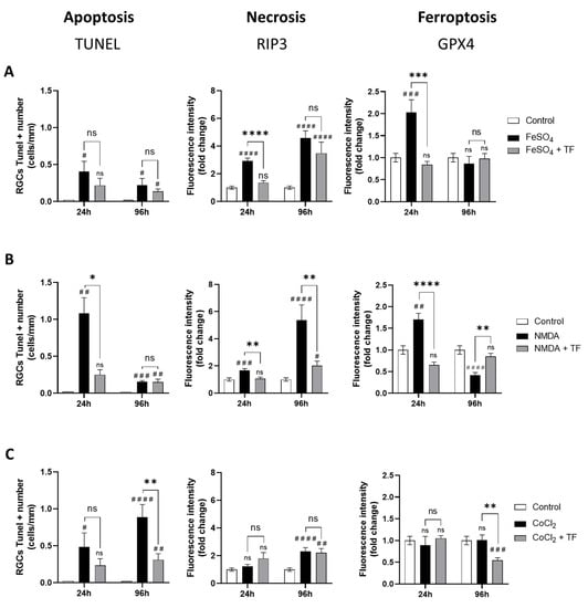 Treatment with TF not only reduced the increase in the number of TUNEL-positive cells induced by NMDA and CoCl2 (Figure 3B,C), but also reduced and even prevented the increase in RIP3 immunostaining induced by FeSO4 and NMDA, respectively (Figure 3A,B). Finally, TF prevented the increase in GPX4 expression induced by FeSO4 or NMDA, maintaining control levels of GPX4 in both conditions (Figure 3A,B). Altogether, these findings indicate that the protective effect of TF is not limited to ferroptosis but extends to other death mechanisms such as apoptosis or necrosis.