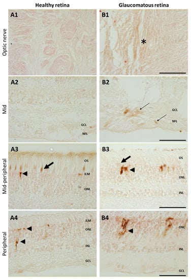 To confirm iron accumulation in human glaucomatous retinas, glaucoma and healthy retina sections were stained with enhanced Perls’ reaction (Figure 5). In the mid- and peripheral retinas of healthy patients, iron deposits were only observed in cone outer segments (arrow) and in the Müller glial cell end-feet (arrowhead) (Figure 5A3). In retinas from a glaucomatous patient, brown iron precipitates were observed in the optic nerve (Figure 5B1, asterisk) in the nerve fiber layer and in the ganglion cells around the optic nerve head (Figure 5B2, thin arrows), whilst iron labeling was reduced in cone outer segments and higher in Müller glial cell end-feet (Figure 5B3) compared to healthy retinas. In the peripheral retina from the glaucomatous eye (Figure 5B4), iron accumulated in Müller glial cells (compared to healthy eye Figure 5A4). These results show that iron distribution differs in glaucomatous as compared to healthy retinas, with a reduction in cones and overload in Müller glia, RGCs, and axons surrounding the optic nerve.