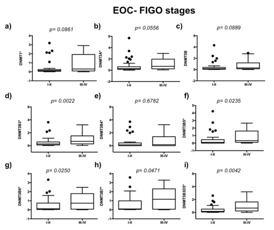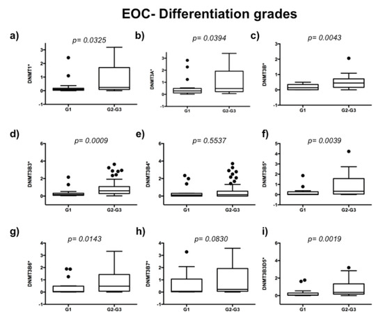 To evaluate the expression of DNMTs in 63 EOC samples, we used 10 ovarian disease-free tissue samples as controls of DNMTs’ basal expression. We analyzed if DNMTs are related to the ovarian carcinoma stage of the disease. We observed higher expression of DNMT3B3 (p = 0.0022), DNMT3B5 (p = 0.0235), DNMT3B6 (p = 0.0250), DNMT3B7 (p = 0.0471), and DNMT3B3Δ5 (p = 0.0042) in an advanced stage of ovarian carcinoma (Figure 1d,f–i). In contrast, we did not observe significant differences in the expression of DNMT1 (p = 0.0861), DNMT3A (p = 0.0556), DNMT3B1 (p = 0.889), and DNMT3B4 (p = 0.6782) (Figure 1a–c,e). Then, we compared DNMTs’ expression from high-grade tumors (medium- and high-grade endometrioid cancer cells, clear cancer cells, high-grade serous ovarian carcinomas, and mixed ovarian cancers) versus low-grade EOC samples (low-grade endometrioid, mucinous cancer cells, and low-grade serous ovarian carcinomas) (Figure 2). We found higher expression of DNMT1 (p = 0.0325), DNMT3A (p = 0.0394), DNMT3B1 (p = 0.0068), DNMT3B3 (p = 0.0171), DNMT3B5 (p = 0.0039), DNMT3B6 (p = 0.0143), and DNMT3B3Δ5 (p = 0.0148) in high-grade ovarian carcinoma (Figure 2a–d,f,g,i). In contrast, we did not find significant differences in the expression of DNMT3B4 (p = 0.5537) and DNMT3B7 (p = 0.0830) (Figure 2e,h).