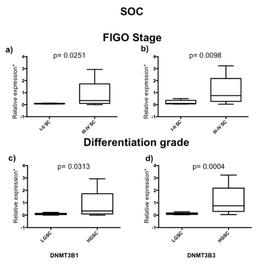 DNMT3B1 and DNMT3B3 expression according to grade and clinical stages in serous ovarian carcinoma (SOC). DNMT3B isoforms’ expression in serous ovarian carcinoma (n = 27): LGSOC (low-grade serous carcinoma) (n = 6) versus HGSOC (high-grade ovarian carcinoma) (n = 21) and stages I–II (early disease stages) (n = 6) versus stages III–IV (advanced stages) (n = 21). DNMT3B1: (a) grade and (c) stage, and DNMT3B3: (b) grade and (d) stage. Assays were normalized with GAPDH expression in each case and ten controls of the normal ovary. Mann–Whitney U test was used. * 1 + log-transformed.