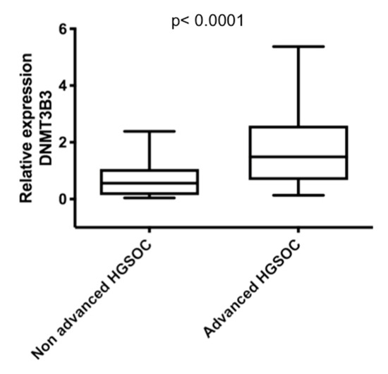 DNMT3B3 overexpression validated in advanced stages of high-grade serous ovarian carcinoma (HGSOC). DNMT3B3 isoform overexpression in two arrays of cDNA rapid cDNA panels: II and III, of ovarian carcinoma (TissueScan Ovarian Cancer cDNA arrays II and III) (OriGene Technologies, Rockville MD) (cat. no. HORT102, and 103) (n = 82). Non-advanced HGSOC (n = 23: mucinous, low-grade serous ovarian carcinoma, endometrioid, carcinoma clear cells, and stages I–II of HGSOC) versus advanced HGSOC (n = 59: stages III–IV of HGSOC). Assays were normalized with GAPDH expression in each case and ten controls of the normal ovary. Mann–Whitney U test was used.