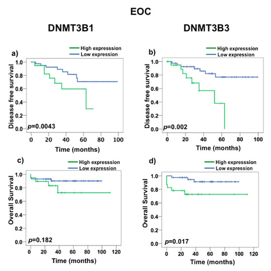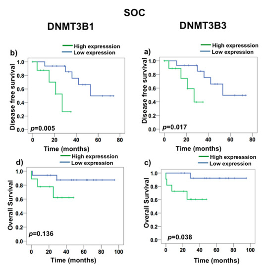 To test if DNMT3B1 and DNMT3B3 have a prognostic value in death and recurrence, we first realized a ROC curve to determine the value that we consider as overexpression. We found that DNMT3B3 had a cut-off 3.29 in a curve area of 72%, 87% of sensitivity, and 71% of specificity (Supplementary Figure S1). Nonetheless, DNMT3B1 had curve areas greater than 50%, but they were less than the DNMT3B3 curve area. To evaluate the prognostic value of DNMT3B1 and DNMT3B3 overexpression, we performed a Kaplan–Meyer survival analysis (Figure 5 and Figure 6). DNMT3B1 overexpression was associated with DFS (p = 0.0043), but it did not associate with OS (p = 0.182) (Figure 5a,c), and DNMT3B3 overexpression was associated with both DFS (p = 0.002) and OS (p = 0.017) in EOC (Figure 5c,d). Additionally, DNMT3B1 overexpression was associated with DFS (p = 0.005) and did not associate with OS (p = 0.136) (Figure 6a,c). Interestingly, DNMT3B3 overexpression was associated with DFS (p = 0.002) and OS (p = 0.017) in SOC (Figure 6c,d). These results suggest that the overexpression of the DNMT3B3 isoform could be helpful as a prognostic biomarker in EOC cancer patients, in contrast to DNMT paralogues and DNMT3B isoforms.