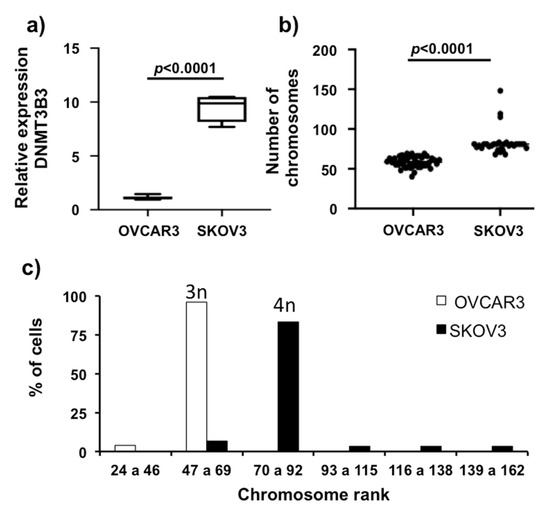 We observed that ovarian cancer tumors have DNMT3B3 overexpression associated with poor prognosis of patients with ovarian carcinoma. Next, we validated the overexpression of DNMT3B3 in advanced, high-grade, serous ovarian carcinoma in cell lines. We measured the quantity of mRNA of DNMT3B3 from ovarian carcinoma cell lines OVCAR3 and SKOV3 compared to a primary culture: ovarian superficial epithelial (OSE). We found that OVCAR3 and SKOV3 overexpress DNMT3B3 compared with OSE (p < 0.001). SKOV3 overexpressed 10-fold the quantity of DNMT3B3 compared with OVCAR3 (p < 0.001) (Figure 7a). Next, we characterized chromosome numbers by counting cellular chromosomes (30 cellular metaphases) (Figure 7b,c). We found that these high-grade advanced ovarian carcinoma cell lines, OVCAR3 and SKOV3, have chromosome instability. The variation of chromosome numbers in OVCAR3 has a range from 40 to 69 chromosomes per cell (hipotriploid cell line) with a mode in 57 chromosomes (relative frequency of 14.58% of cells), and SKOV3 is more variable, with a range from 68 to 83 (hipotetraploid), with some cells present in lesser frequency: 115, 119, and 148 (relative frequency of 3.3% of cells) chromosomes per cell, having a mode in 81 chromosomes (relative frequency of 36.6% of cells). Interestingly, SKOV3 overexpresses DNMT3B3 and has more aggressive characters and a more variable number of chromosomes. These results suggest that DNMT3B3 overexpression could be a biomarker of tumor aggressiveness.