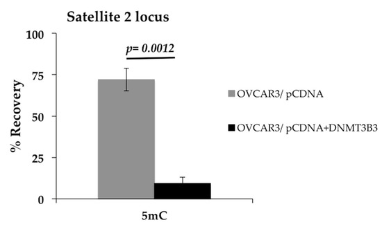 Since we observed an association of DNMT3B3 with poor prognosis in patients, we wanted to know if this could be related to DNA methylation of satellite 2, which is well-known as a possible cause of chromosome instability (CIN) [7]. Therefore, we analyzed the effect of exogenous overexpression of DNMT3B3 by transitory transfection in the OVCAR3 cell line. Then, we asked if overexpression of DNMT3B3 is a cause of DNA hypomethylation. Hence, we overexpressed DNMT3B3 and found that satellite 2 sequences were hypomethylated after the DNMT3B3 transfection in OVCAR3 (Figure 8).