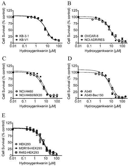 Intrinsic cytotoxicity of hydroxygenkwanin in normal and ABCB1- and ABCG2-overexpressing cell lines. The cytotoxicity of hydroxygenkwanin was determined in (A) the human epidermal cancer KB-3-1 cell line (empty circles) and its ABCB1-overexpressing subline KB-V1 (filled circles), (B) the human ovarian cancer OVCAR-8 cell line (empty circles) and its ABCB1-overexpressing subline NCI-ADR-RES (filled circles), (C) the human NSCLC NCI-H460 cell line (empty circles) and its ABCG2-overexpressing subline NCI-H460/MX20 (filled circles), (D) the human NSCLC A549 cell line (empty circles) and its ABCG2-overexpressing subline A549-Bec150 (filled circles), as well as in (E), the parental pcDNA3.1-HEK293 (empty circles), MDR19-HEK293 (HEK293 cells transfected with human ABCB1, filled circles), and R482-HEK293 (HEK293 cells transfected with human ABCG2, empty squares) cell lines. Points: mean values from at least three independent experiments; bars: SEM.