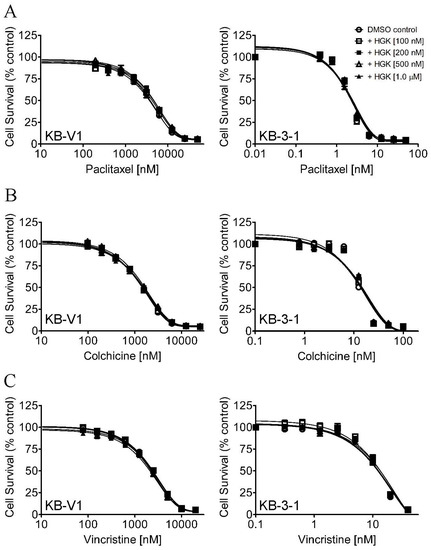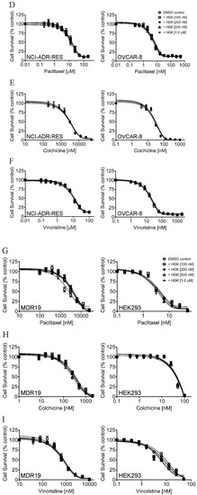 Cytotoxicity of ABCB1 substrate drugs in the absence or presence of hydroxygenkwanin. The cytotoxicity of paclitaxel, colchicine, and vincristine was determined in (A–C) KB-V1 and KB-3-1, (D–F) NCI-ADR-RES and OVCAR-8, and (G–I) MDR19-HEK293 and pcDNA3.1-HEK293 cells in the presence of DMSO (open circles) or hydroxygenkwanin (HGK) at 100 nM (open squares), 200 nM (filled squares), 500 nM (open triangles), or 1.0 μM (filled triangles), as described in the Section 4. Points, mean values from at least three independent experiments; bars; SEM.