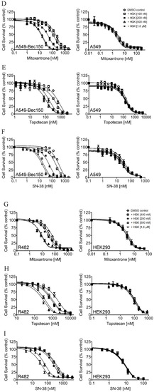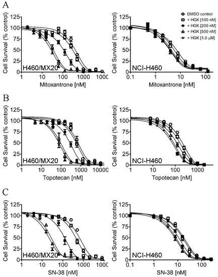 Cytotoxicity of ABCG2 substrate drugs in the absence or presence of hydroxygenkwanin. The cytotoxicity of mitoxantrone, topotecan, and SN-38 was determined in (A–C) NCI-H460/MX20 and NCI-H460, (D–F) A549-Bec150 and A549, and (G–I) R482-HEK293 and pcDNA3.1-HEK293 cells in the presence of DMSO (open circles) or hydroxygenkwanin (HGK) at 100 nM (open squares), 200 nM (filled squares), 500 nM (open triangles), or 1.0 μM (filled triangles) as described in the Section 4. Points, mean values from at least three independent experiments; bars; SEM.
