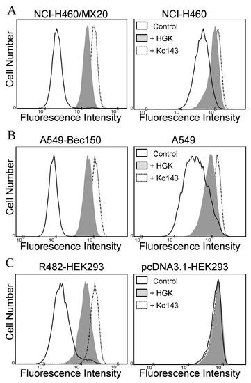 Hydroxygenkwanin attenuates ABCG2-mediated fluorescent substrate transport. The intracellular accumulation of a known fluorescent substrate, pheophorbide A (PhA), was determined in (A) NCI-H460 and NCI-H460/MX20 cancer cell lines, (B) A549 and A549-Bec150 cancer cell lines, and (C) pcDNA3.1-HEK293 and R482-HEK293 cell lines, in the presence of DMSO (control, solid line), 1 μM hydroxygenkwanin (+HGK, gray-shaded solid line), or 5 μM Ko143 (+Ko143, dotted line), which was used as a positive control for ABCG2. The fluorescent signals were analyzed with flow cytometry, as described in the Section 4. Histograms are representative results from at least three independent experiments.