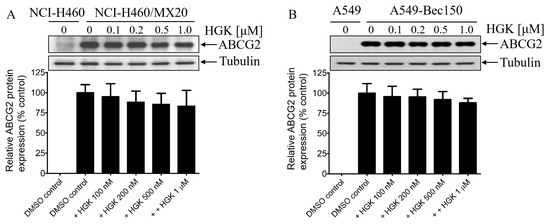 Hydroxygenkwanin does not alter the protein expression of ABCG2 in multidrug-resistant cancer cells. The ABCG2-overexpressing (A) NCI-H460/MX20 and (B) A549-Bec150 cancer cells were treated with DMSO (vehicle control) or hydroxygenkwanin (HGK) at 100 nM, 200 nM, 500 nM, or 1.0 μM for 72 h, and the cell lysates were processed for immunoblot detection and quantification, as described in the Section 4. Representative Western blots (top), and the corresponding quantification (bottom) of the human ABCG2 protein and α-tubulin as the internal loading control, are shown. Values are presented as the mean ± SD were obtained from at least three independent experiments.