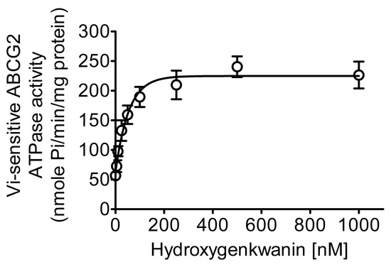 Next, the effect of hydroxygenkwanin on the Vi-sensitive ATPase activity of ABCG2 was determined to gain insight into the interaction between hydroxygenkwanin and ABCG2; this is because the substrates and inhibitors of ABCG2 are known to affect ABCG2-mediated ATP hydrolysis [62,63,64,65]. As shown in Figure 6, the Vi-sensitive ATPase activity of ABCG2 was stimulated by hydroxygenkwanin in a concentration-dependent manner, with a four-fold maximal stimulation (basal activity of 56.62 ± 7.08 nmole Pi/min/mg protein) and a half-maximal effective concentration value (EC50) of approximately 19 nM. Our data indicate that hydroxygenkwanin interacts with, and has a high affinity with, ABCG2, which is in accordance with previous reports that have demonstrated other chemosensitizing agents binding to the drug-binding pocket of ABCG2 and stimulating ABCG2-mediated ATP hydrolysis [52,54,66].