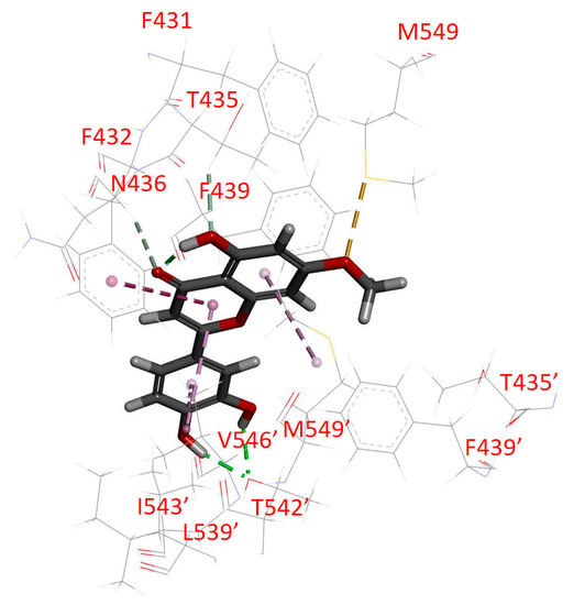 We found that hydroxygenkwanin attenuates ABCG2-mediated drug efflux, as shown after an in silico molecular docking analysis of hydroxygenkwanin in the inward-open structure of human ABCG2 (PDB:6VXH) [67] was performed in order to gain insight into the key amino acid residues that interact with hydroxygenkwanin within the substrate-binding pocket of ABCG2. The lowest energy binding pose indicated numerous common interactions that were reported between substrates/inhibitors and ABCG2 [67,68,69]. The hydrophobic residues, Phe423, Val546′, and Met549′, were predicted to interact with the chromen-4-one core structure and phenyl substituent of hydroxygenkwanin via Pi–Pi/Pi–alkyl interactions (Figure 7). Hydrogen bonds were likely to form between the oxygen atoms on the ligand and Thr435, Asn436, and Thr542′ residues. Residue Met549 was shown to interact via S-X bonding. Thr435, Asn436, and Met549 were previously found to be particularly important residues affecting the function of the ABCG2 transporter. The interaction with Asn436 was found to be important for substrate binding [70], whereas the interaction with Thr435 was shown to be crucial for inhibition via inhibitor Ko143. A mutation of Met549 was reported to reduce drug transport [71].
