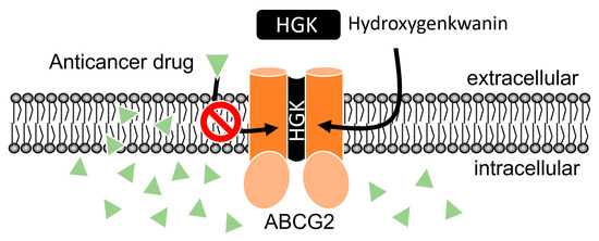A schematic illustration of hydroxygenkwanin (HGK) reversing ABCG2-mediated drug resistance in cancer cells by inhibiting the drug transport function of ABCG2. HGK binds to the drug-binding pocket of ABCG2 and competes with the binding of substrate anticancer drugs of ABCG2 (green triangles), resulting in elevated intracellular concentration and the cytotoxicity of anticancer drugs in ABCG2-overexpressing multidrug-resistant cancer cells.
