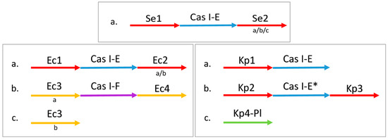 The typical conformation of CRISPR-Cas systems in each taxon. Each configuration (a, b, c) is independent, they do not need to co-exist in the same genome. All the arrays from a CRISPR locus have the same position relative to the Cas cluster (upstream or downstream) along with the same 5′ end-flanking sequence and DRs sequence; those with different 3′ end-flanking sequences are considered different variants of the same locus. The variants are listed below the arrows, in lower-case letters. Ec3a and Ec3b have the same upstream but different downstream sequences. The isolates of S. enterica and K. pneumoniae contain only one Cas-cluster (I-E), while E. coli isolates may have one or two Cas-clusters (I-E and I-F).